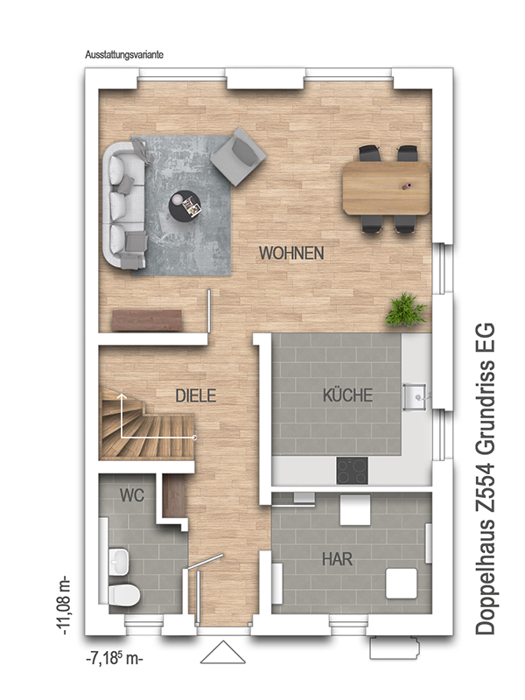 Ein einladender Eingangsbereich empfängt Sie und Ihre Gäste. Der großzügige Wohn- und Essbereich mit direktem Zugang zur Terrasse schafft fließende Übergänge zwischen Innen und Außen. Die offene Küche wird zum kommunikativen Mittelpunkt des Hauses. Ergänzt wird das Erdgeschoss durch einen praktischen Hauswirtschaftsraum sowie ein Gäste-WC, das optional auch als Duschbad realisiert werden kann.