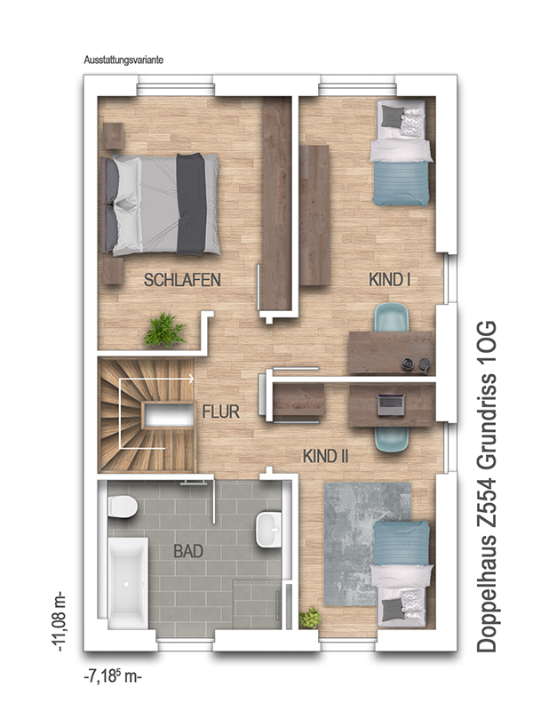 Ein einladender Eingangsbereich empfängt Sie und Ihre Gäste. Der großzügige Wohn- und Essbereich mit direktem Zugang zur Terrasse schafft fließende Übergänge zwischen Innen und Außen. Die offene Küche wird zum kommunikativen Mittelpunkt des Hauses. Ergänzt wird das Erdgeschoss durch einen praktischen Hauswirtschaftsraum sowie ein Gäste-WC, das optional auch als Duschbad realisiert werden kann.